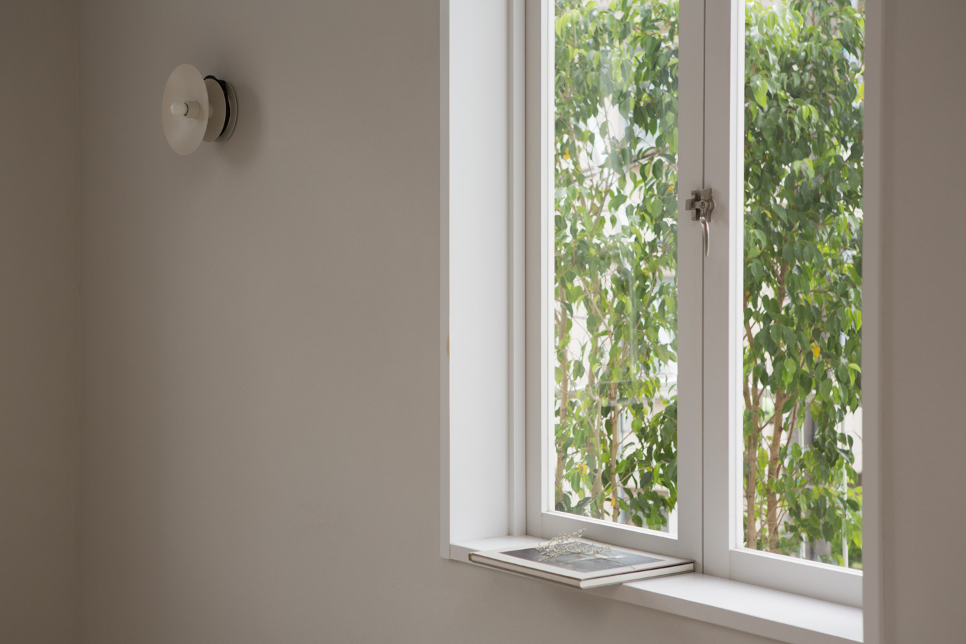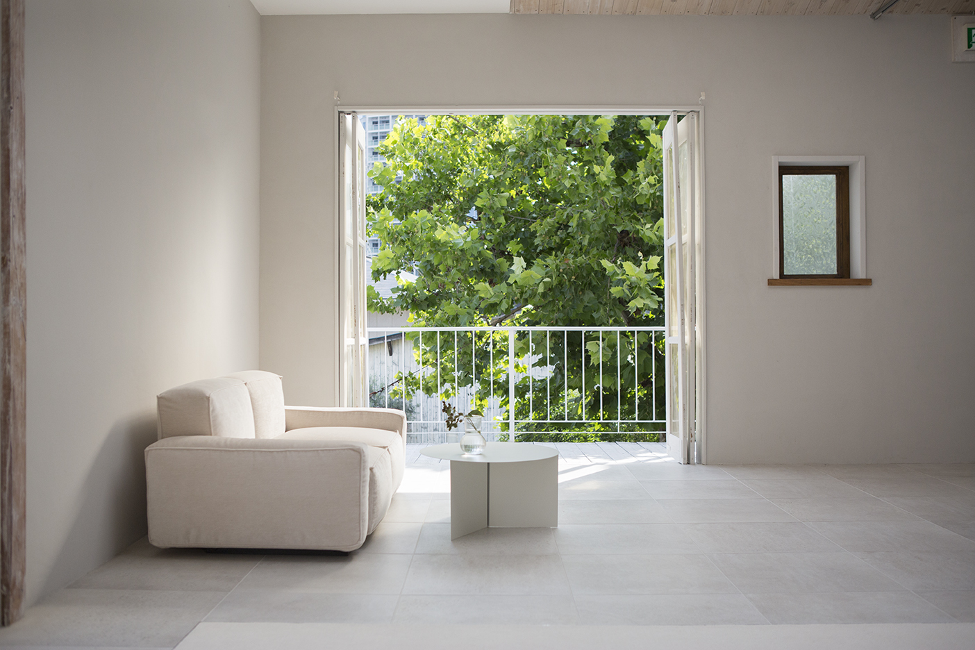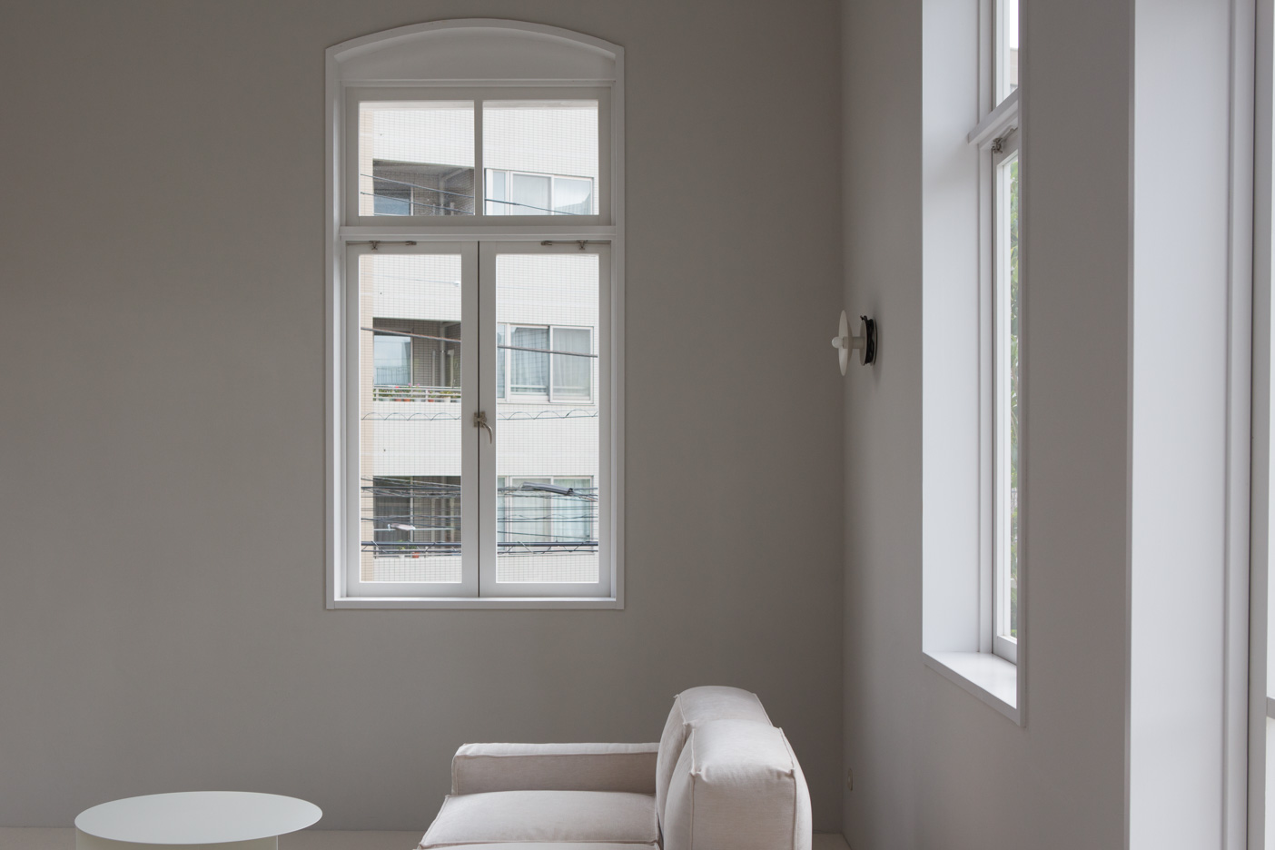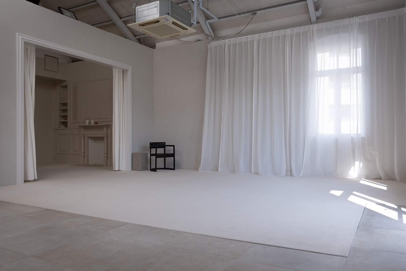 都市の古いアパートメントを改修したモダンな一室を再現しました。高い天窓から注ぐ光と白いカーペットは、部屋全体を明るく柔らかな光で包みます。