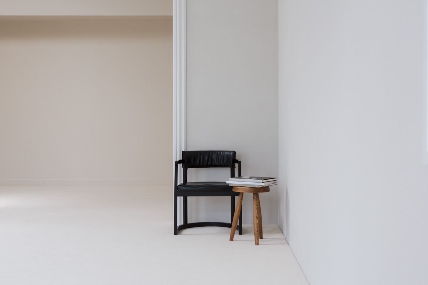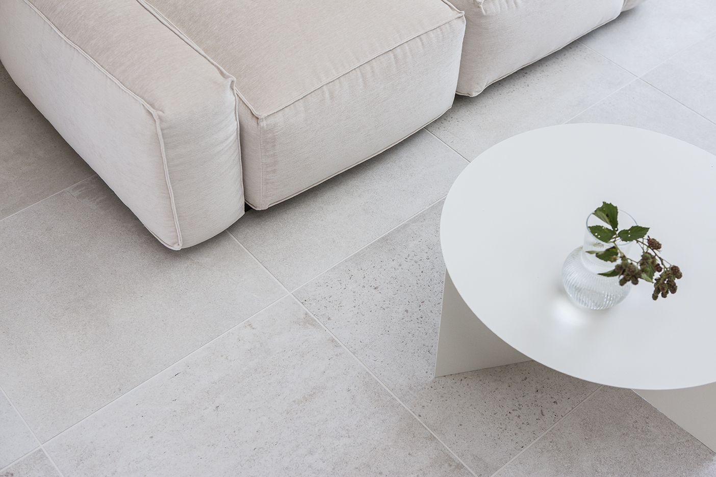 ワントーンで仕上げられたシンプルかつモダンな空間。 爽やかで洗練された印象を与えます。 カーペットやタイル、漆喰壁が自然光を穏やかに反射しています。
