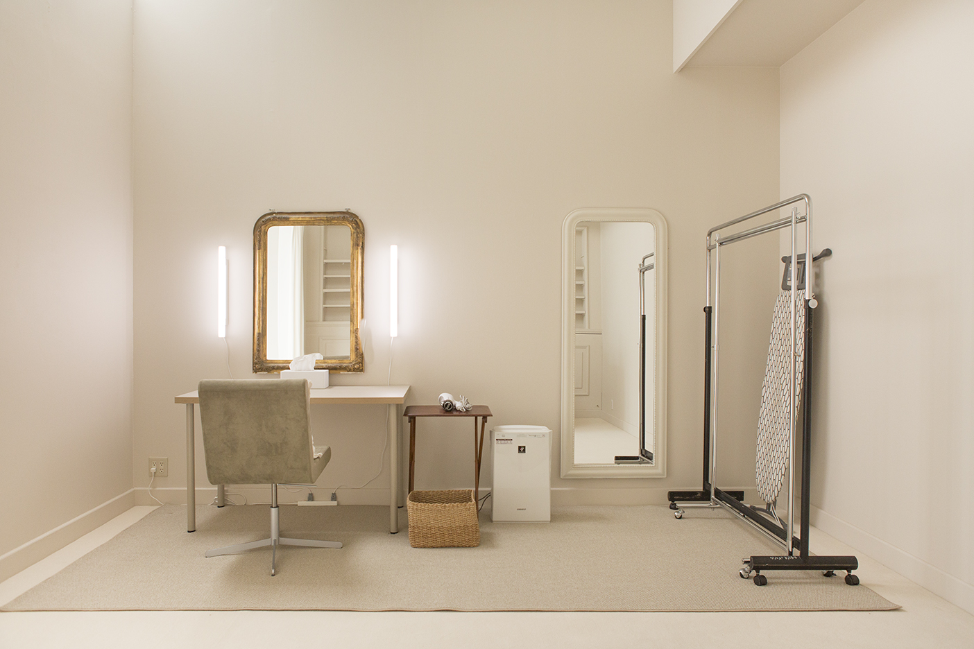 メイクアップスペース 備品:ハンガーラックx2、ハンガー×10、アイロンx1、姿見x1