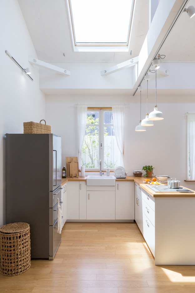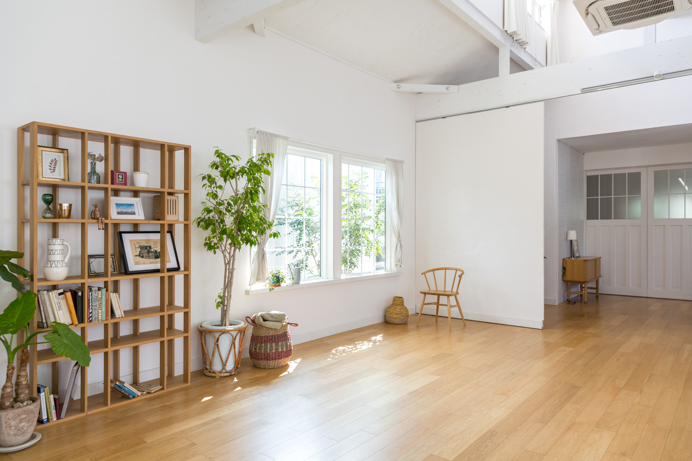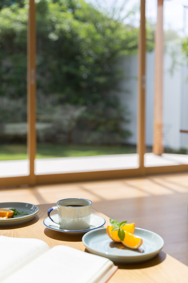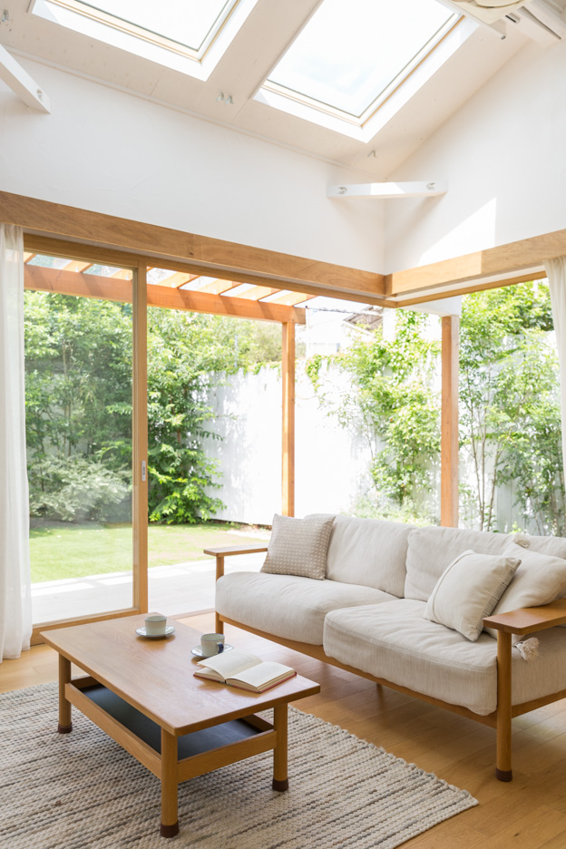 全面開放可能な大きな五枚扉を開け放つと、デッキと一続きにすることができます。あたたかな陽が射し込む高い天窓は自動でブラインドの開閉が可能。窓抜けに緑豊かな庭が広がる開放感のある空間です。