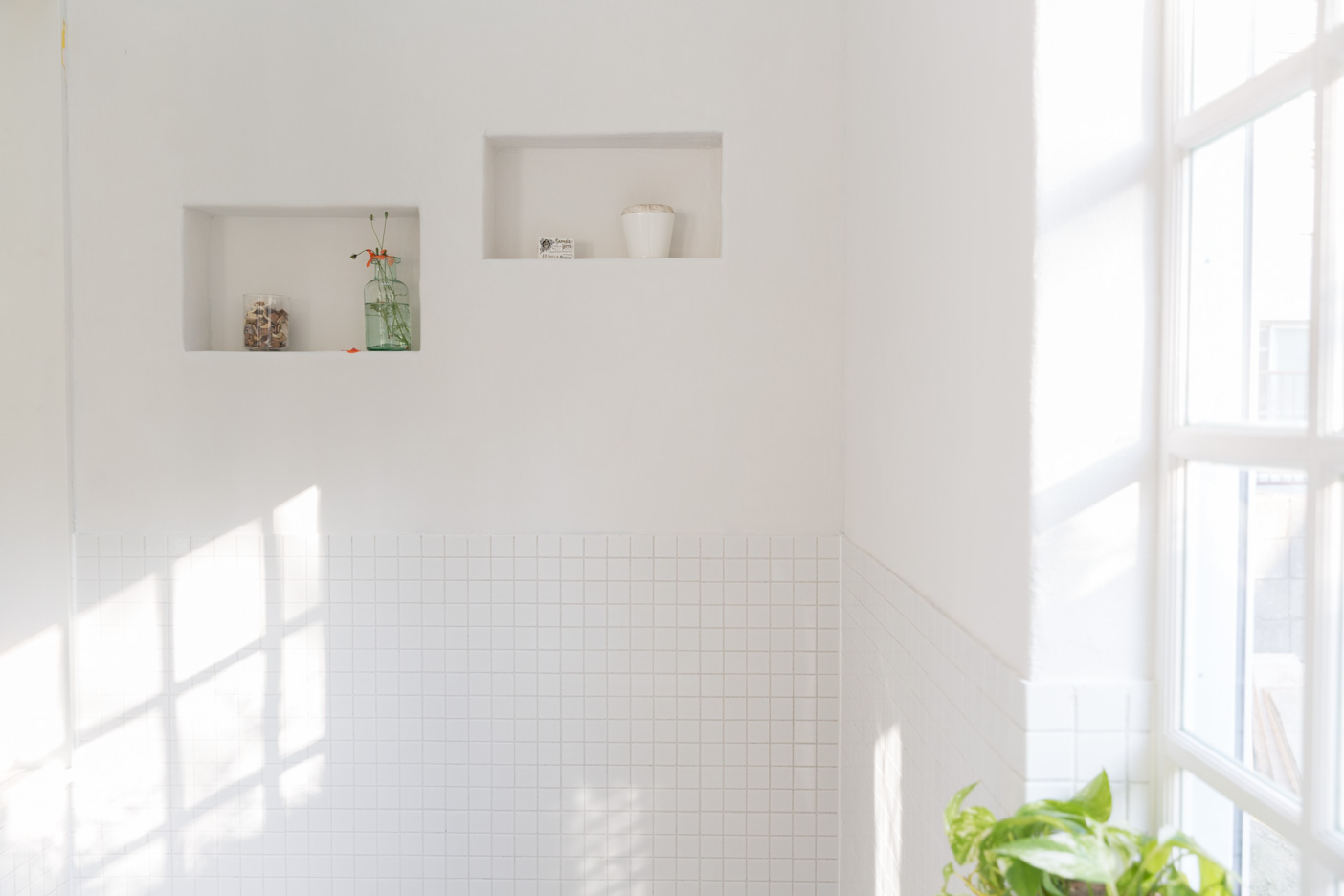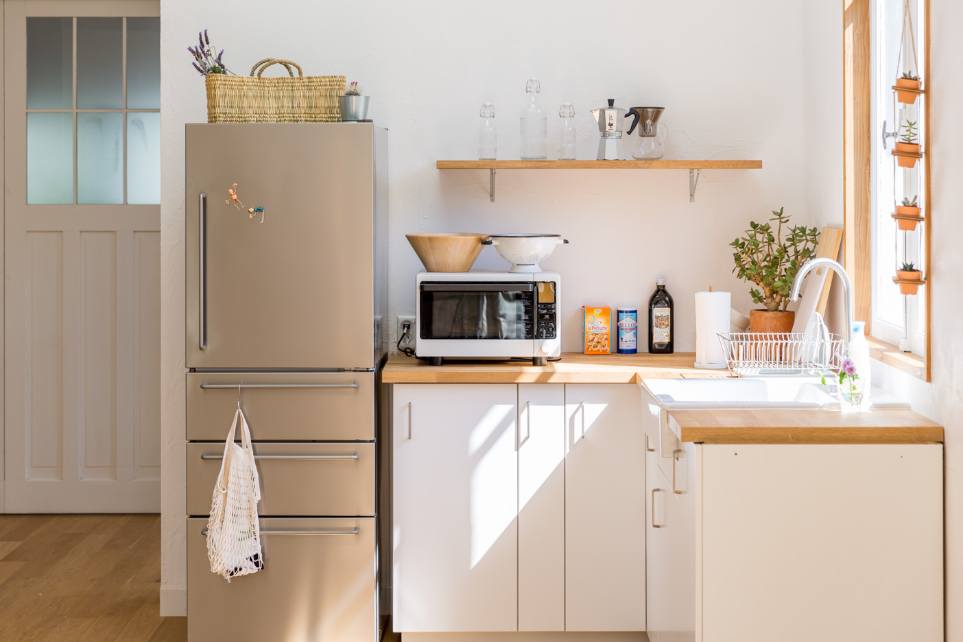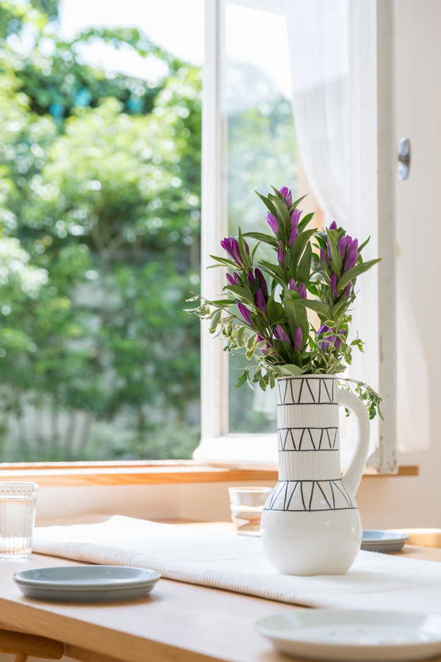 落ち着きがあり、可愛らしさも感じられる塗り壁。並んだ窓のカウンターは物撮りも可能。