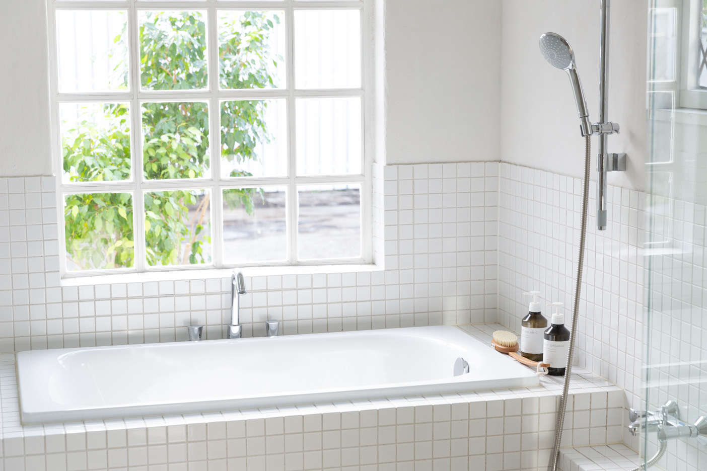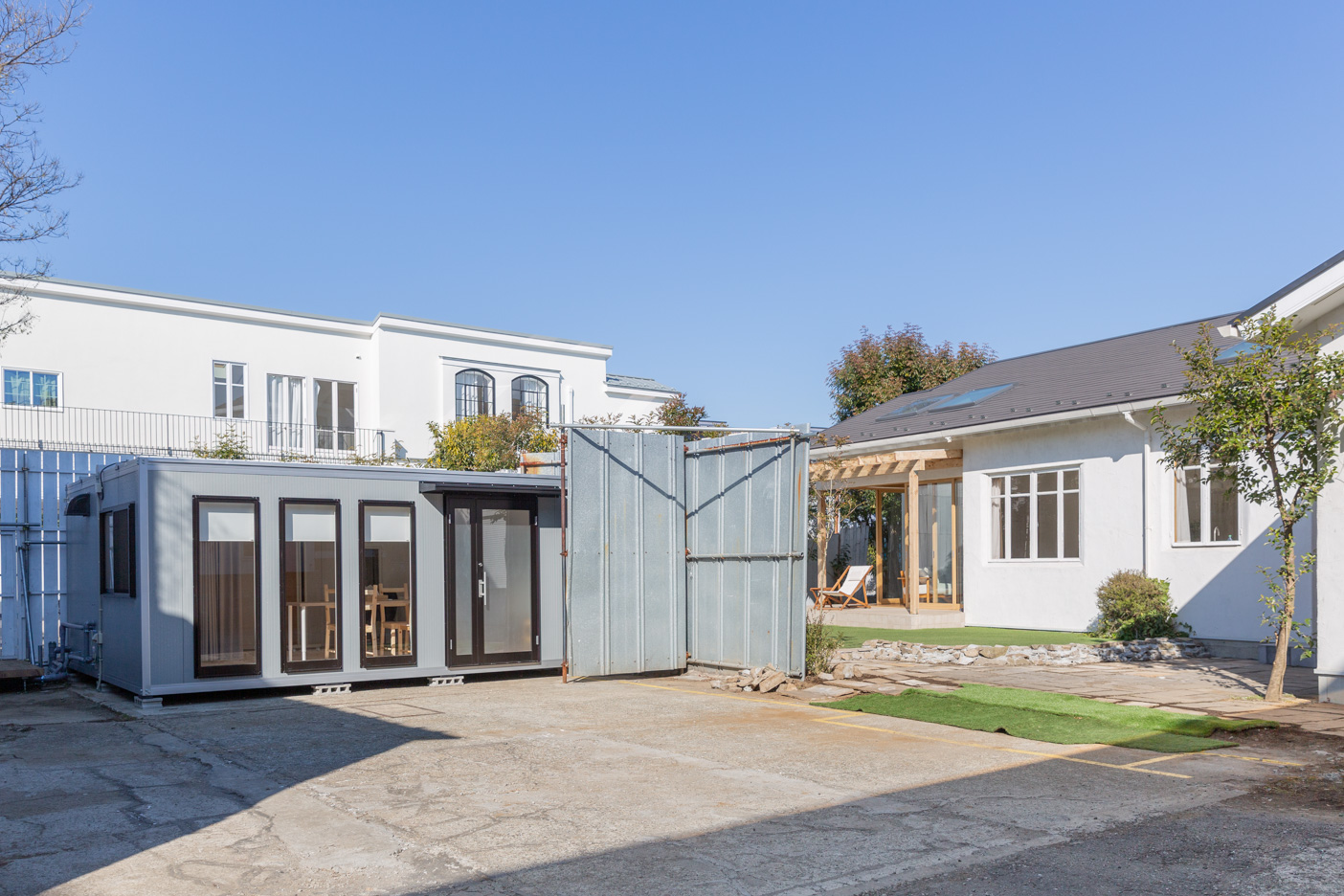 高い窓からひかりを採り込んだリビング。五枚の大きな木枠の引き戸を開けるとタイルデッキが続き、その先には緑の芝生が広がる抜群の開放感。可動式キッチン・洗面台・バスルームにトイレ。生活シーンの撮影イメージが広がる住宅型スタジオです。