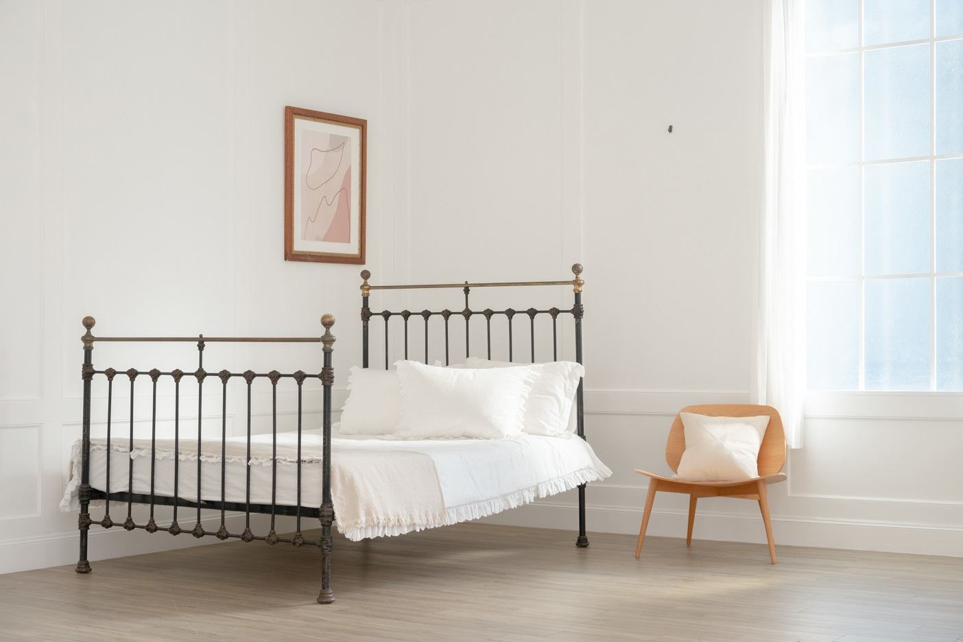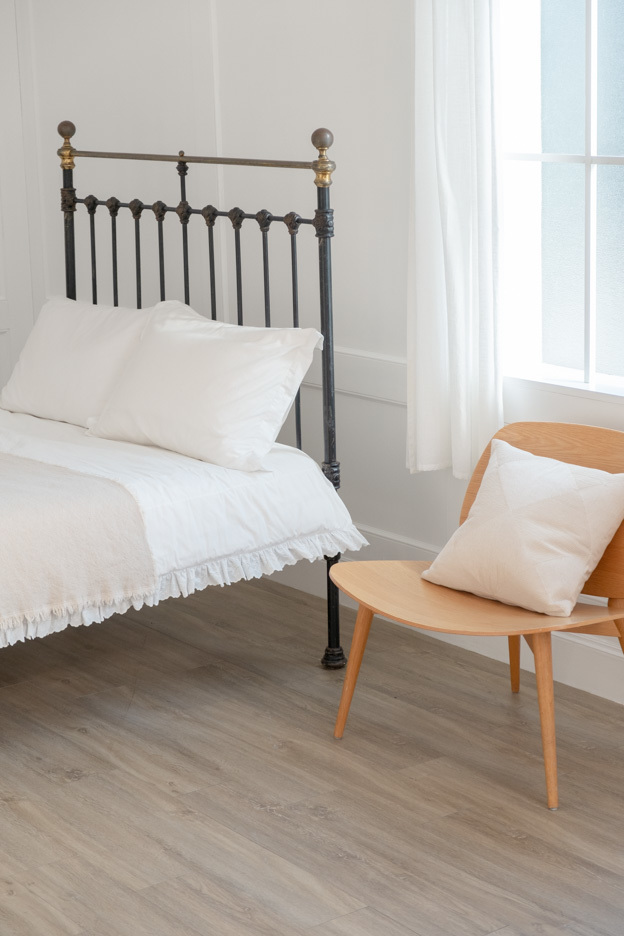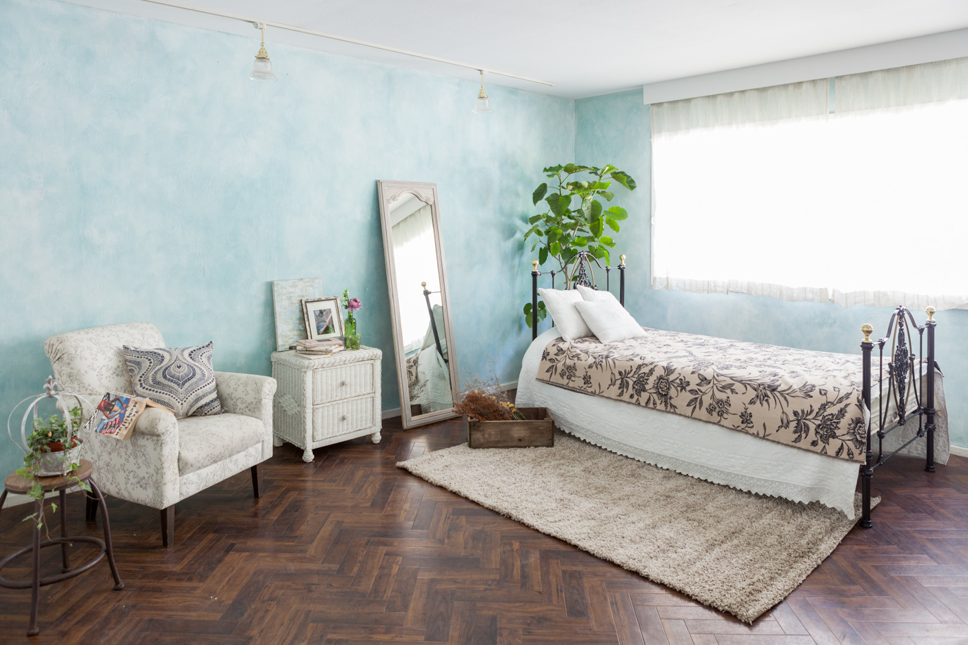 ヘリンボーンのアンティークフローリング(イギリス産オーク)と、かわいらしいフレームのベッドが好相性です。