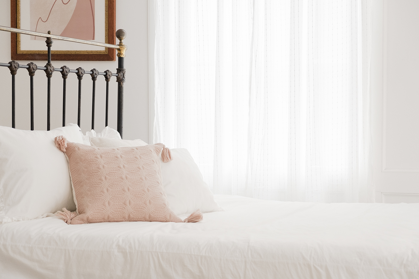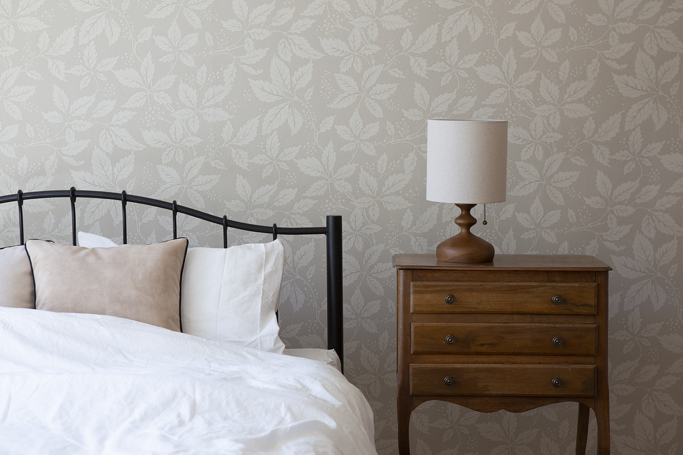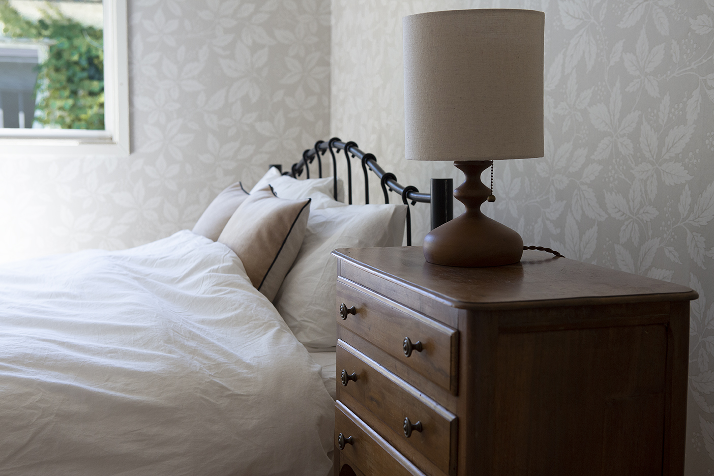 ヘリンボーンのアンティークフローリング(イギリス産オーク)と、かわいらしいフレームのベッドが好相性です。