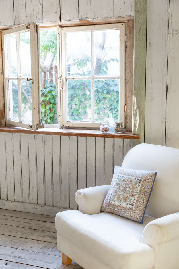 天窓と南西側に大きく開く掃き出し窓からは光が差し込み明るい空間になります。白い木目の床は高級感を演出し、家具の撮影などにも向いた広めのお部屋です。