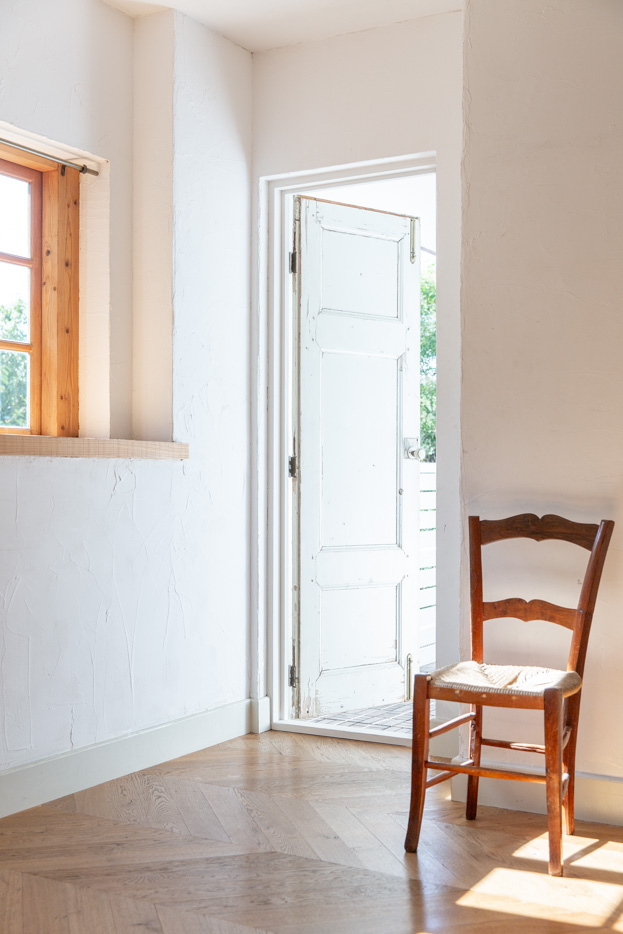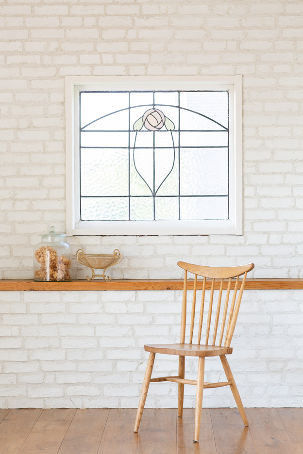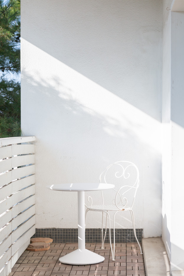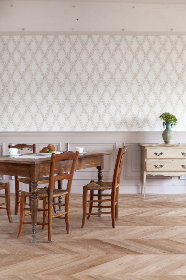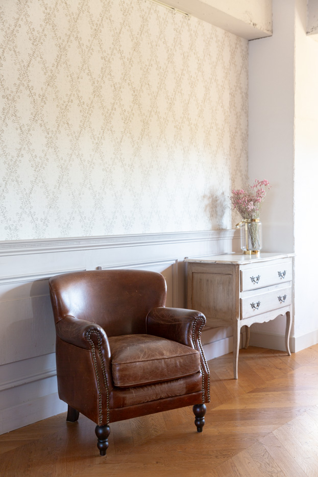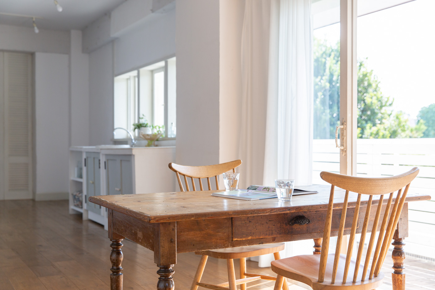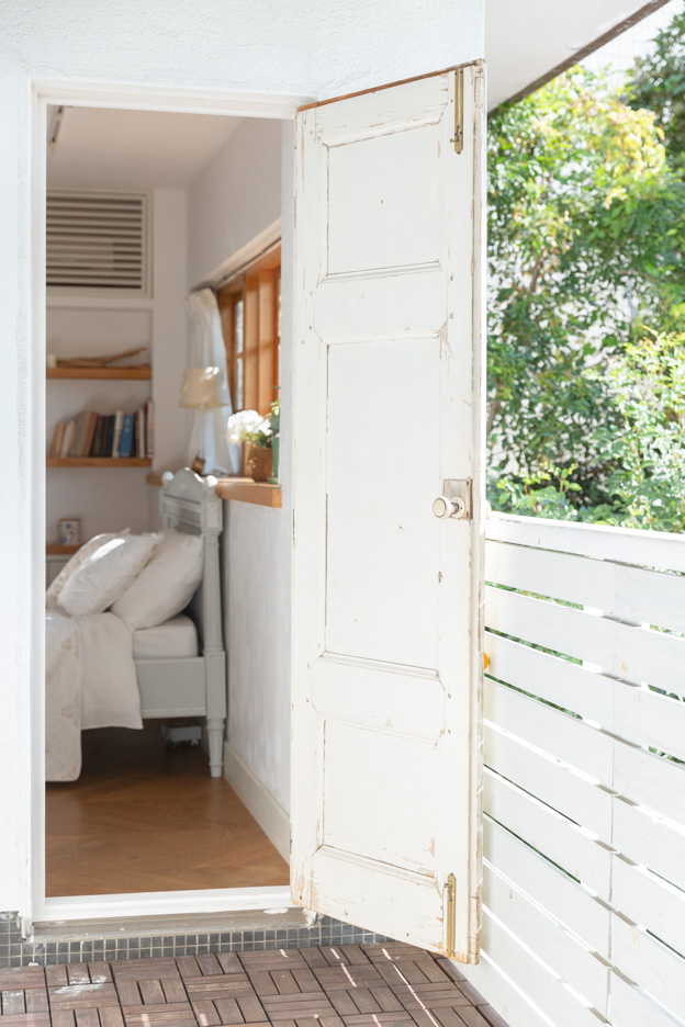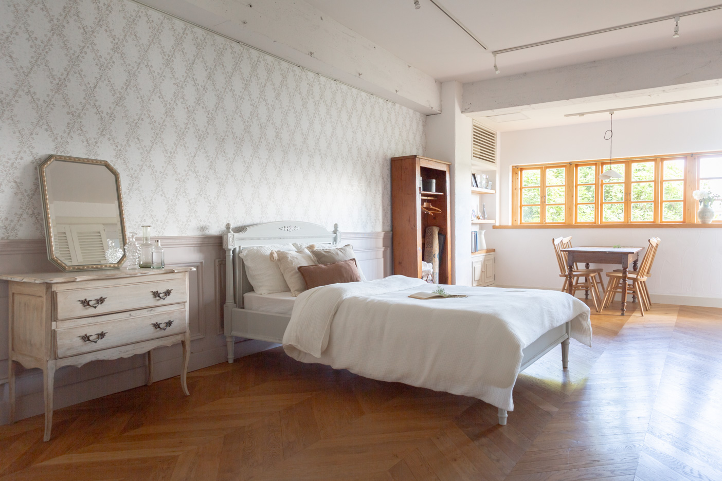 見晴らしのよいテラスと、アンティークを取り入れた可愛らしい雰囲気。大人の女性の部屋をイメージした上品な壁紙と、落ち着いた色合いの腰壁。パステルカラーのドア、白い煉瓦の壁も印象的。ナチュラルな木の床が柔らかさを作っています。