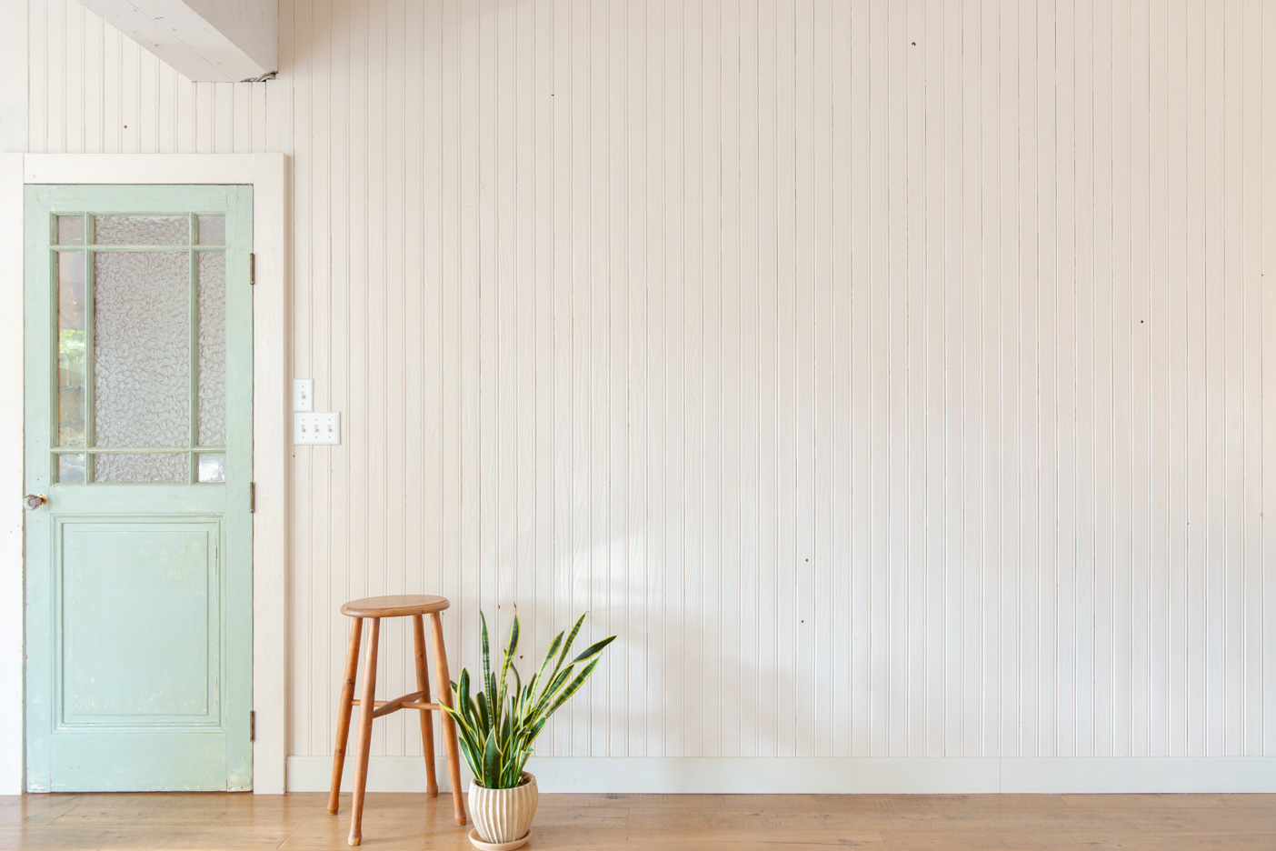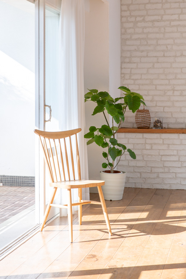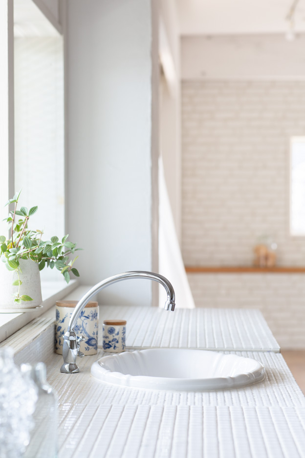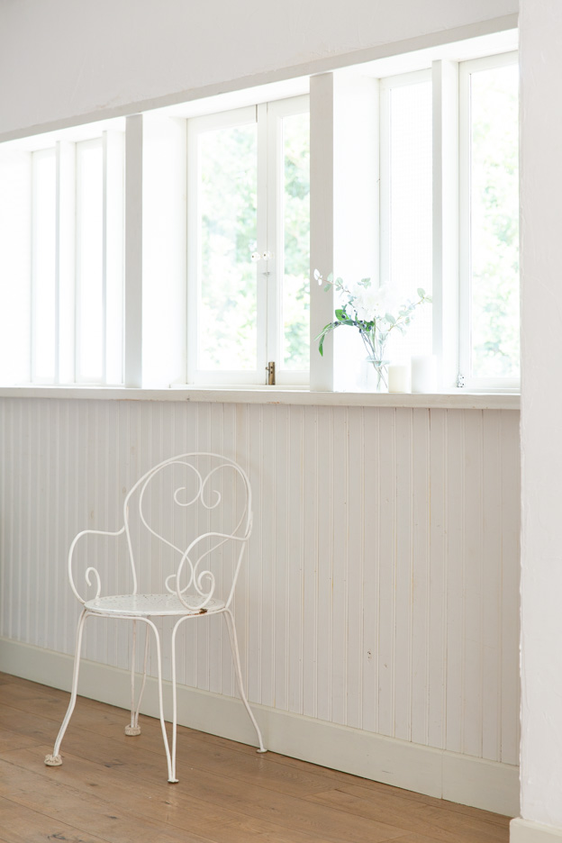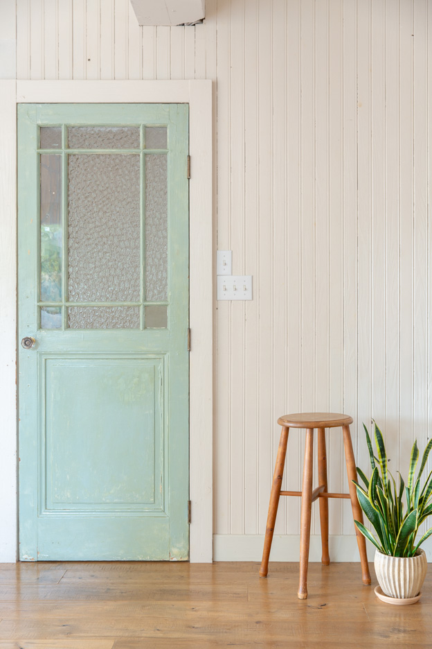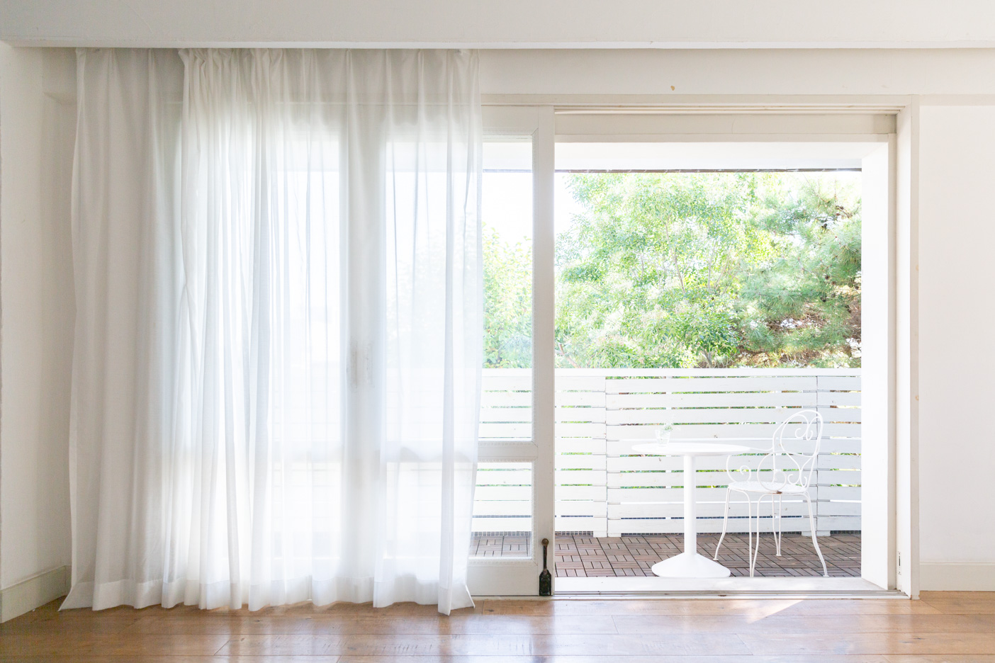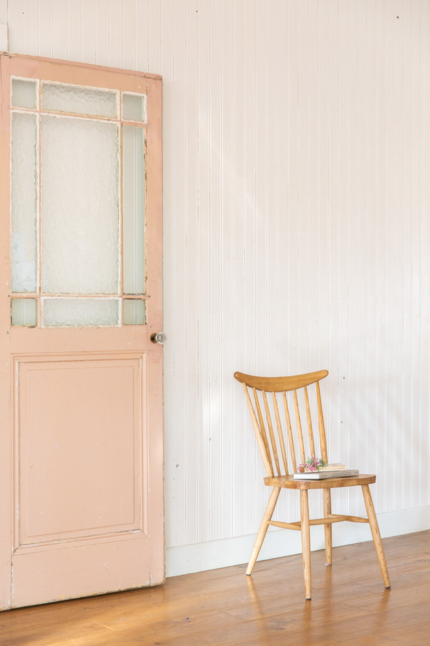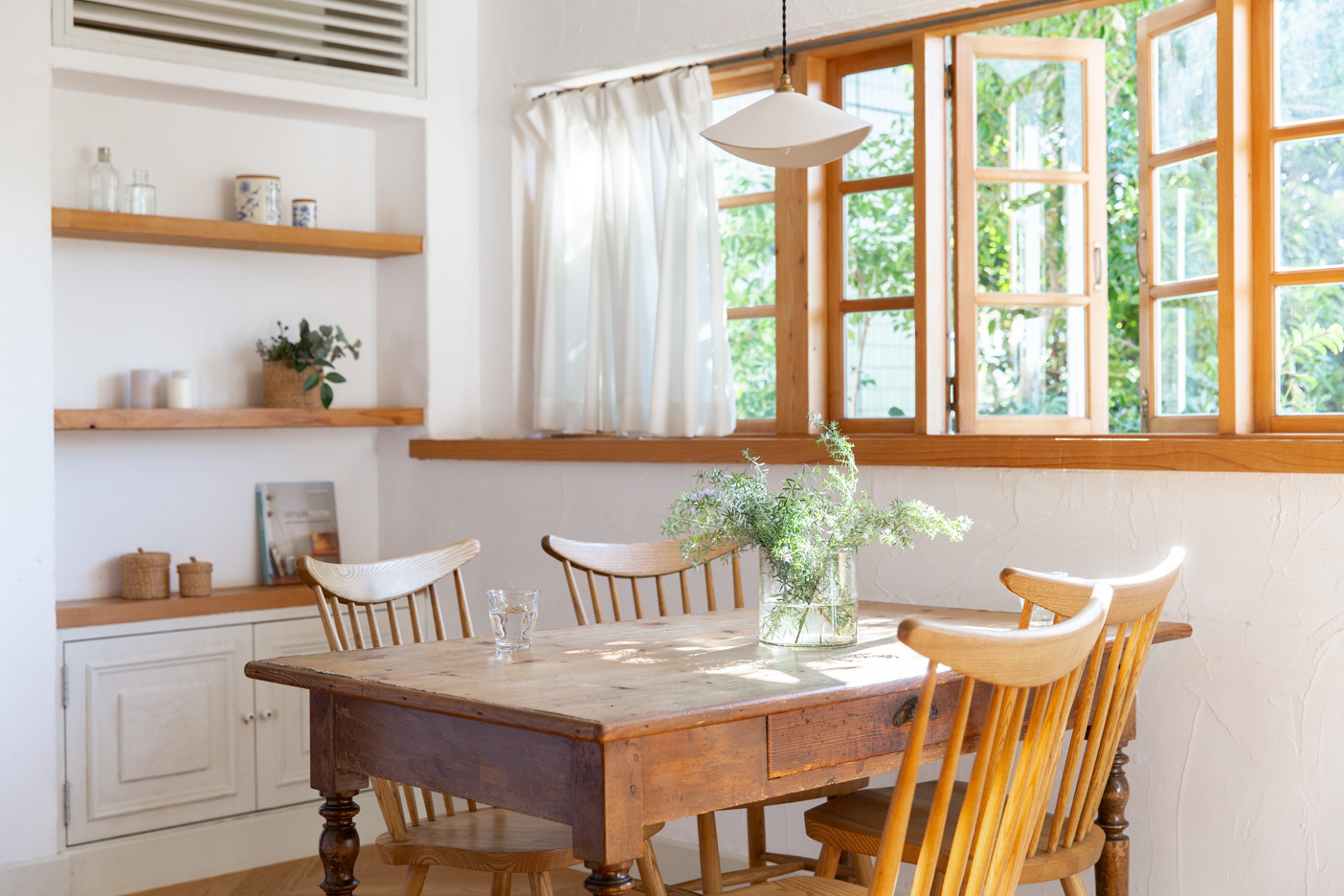 見晴らしのよいテラスと、アンティークを取り入れた可愛らしい雰囲気。大人の女性の部屋をイメージした上品な壁紙と、落ち着いた色合いの腰壁。パステルカラーのドア、白い煉瓦の壁も印象的。ナチュラルな木の床が柔らかさを作っています。