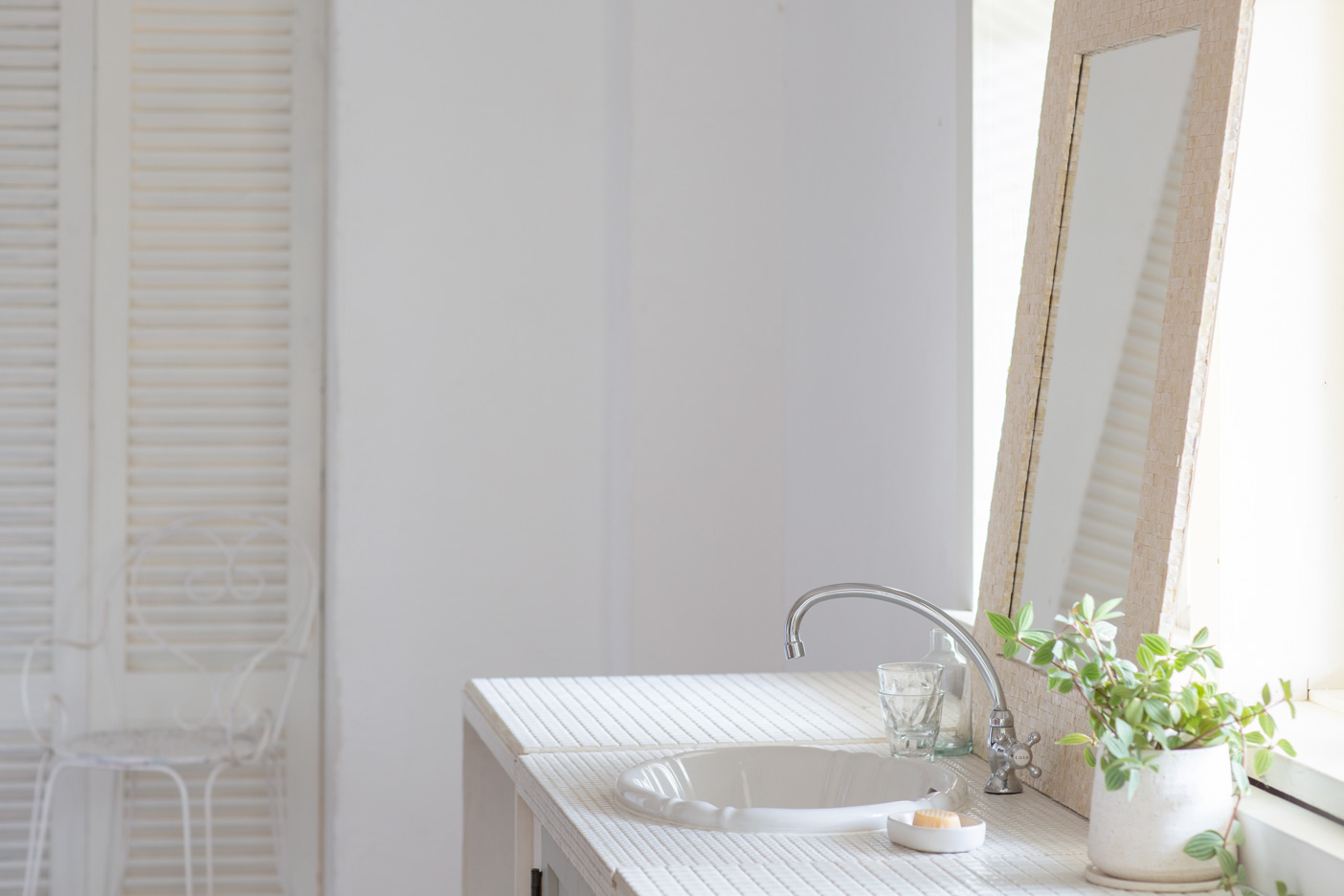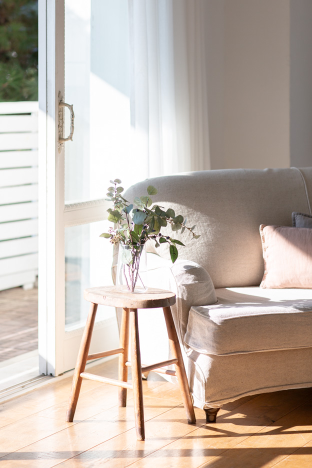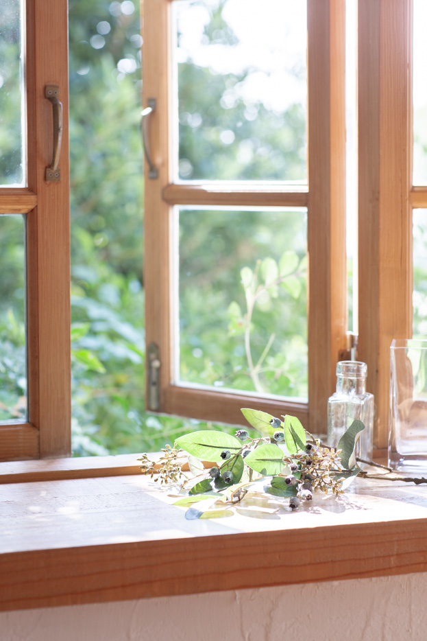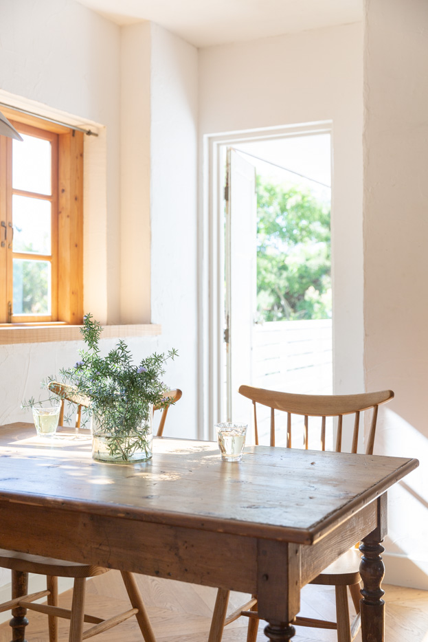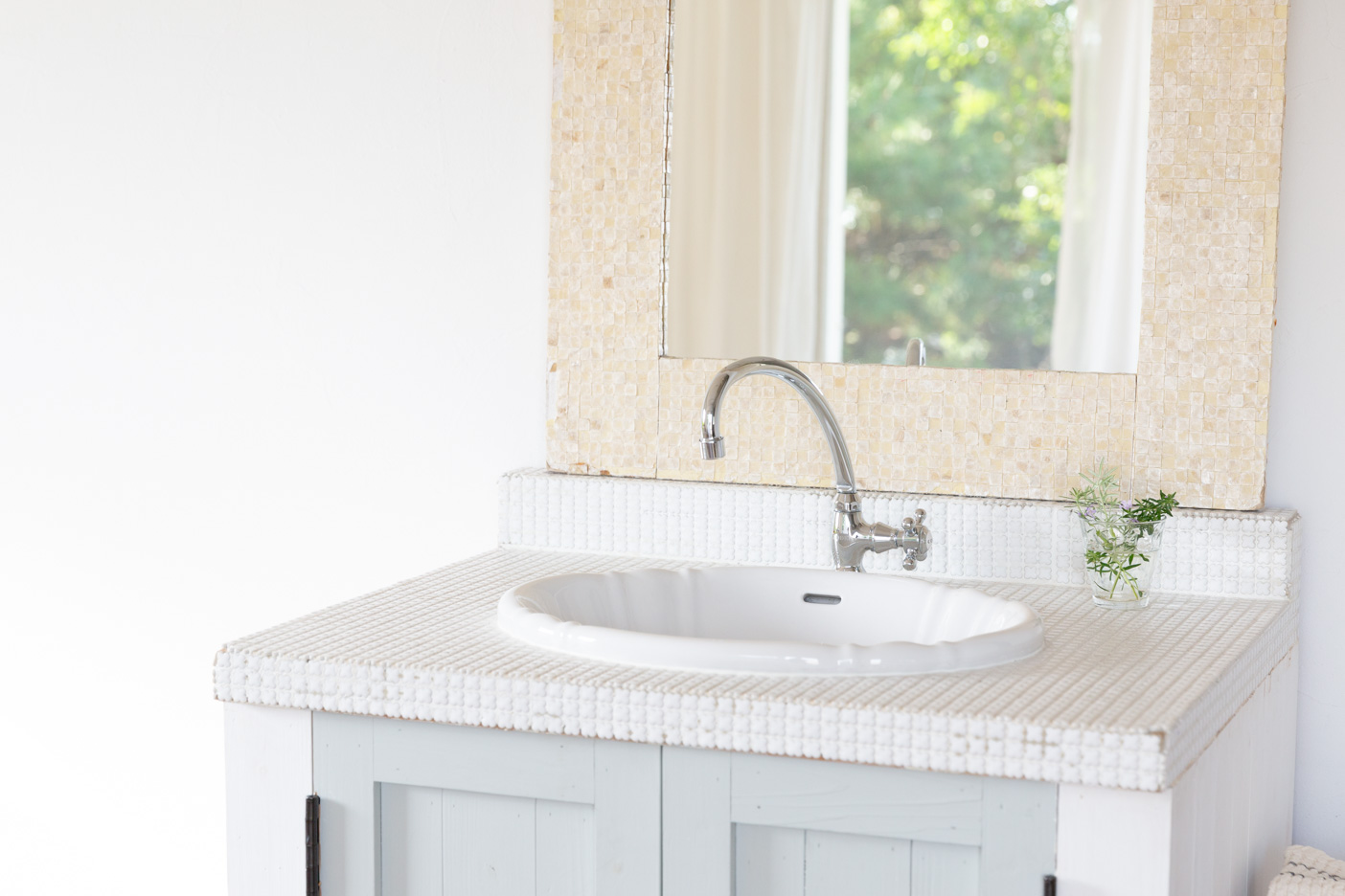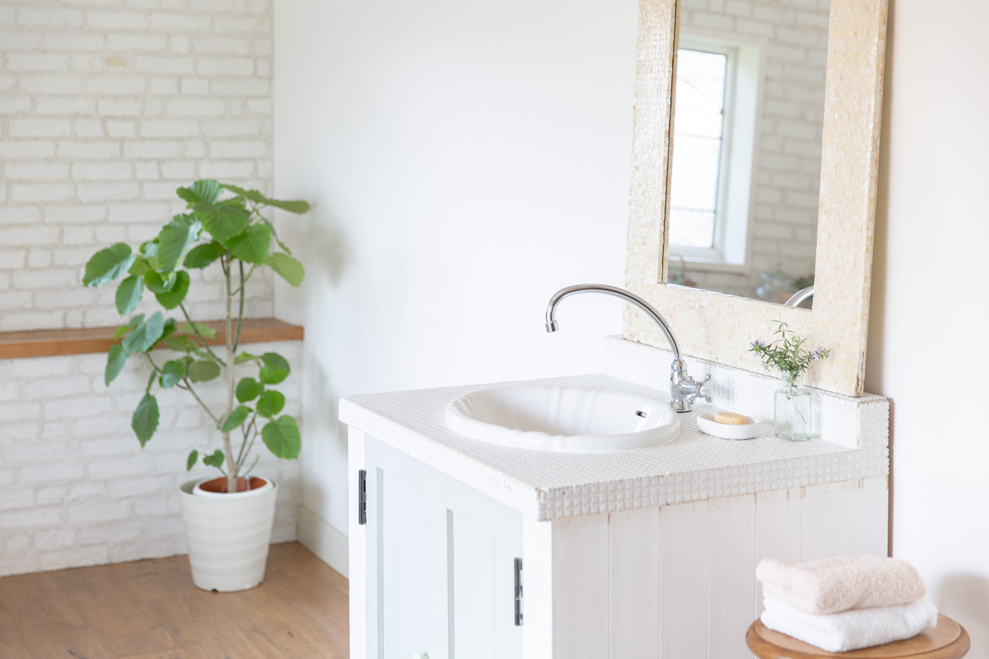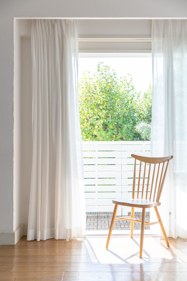 見晴らしのよいテラスと、アンティークを取り入れた可愛らしい雰囲気。大人の女性の部屋をイメージした上品な壁紙と、落ち着いた色合いの腰壁。パステルカラーのドア、白い煉瓦の壁も印象的。ナチュラルな木の床が柔らかさを作っています。