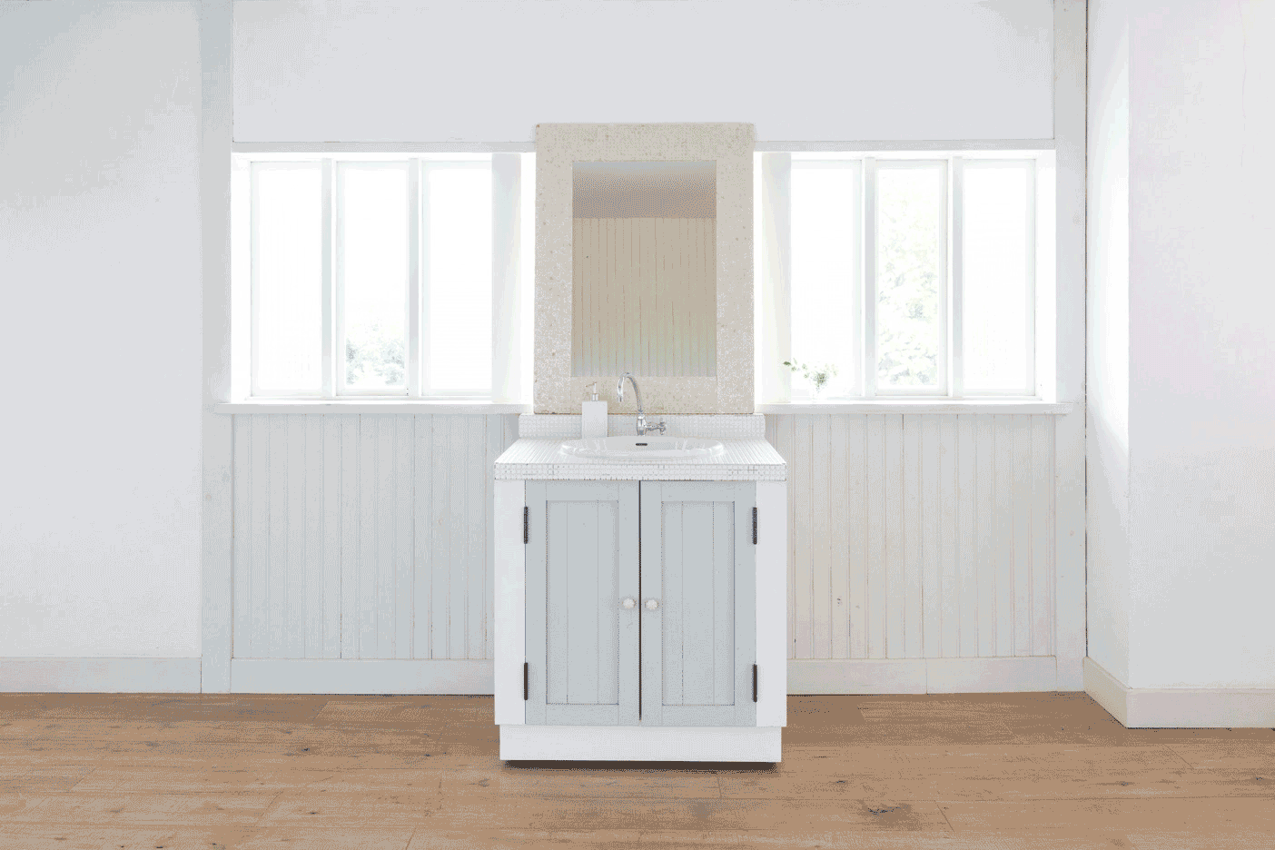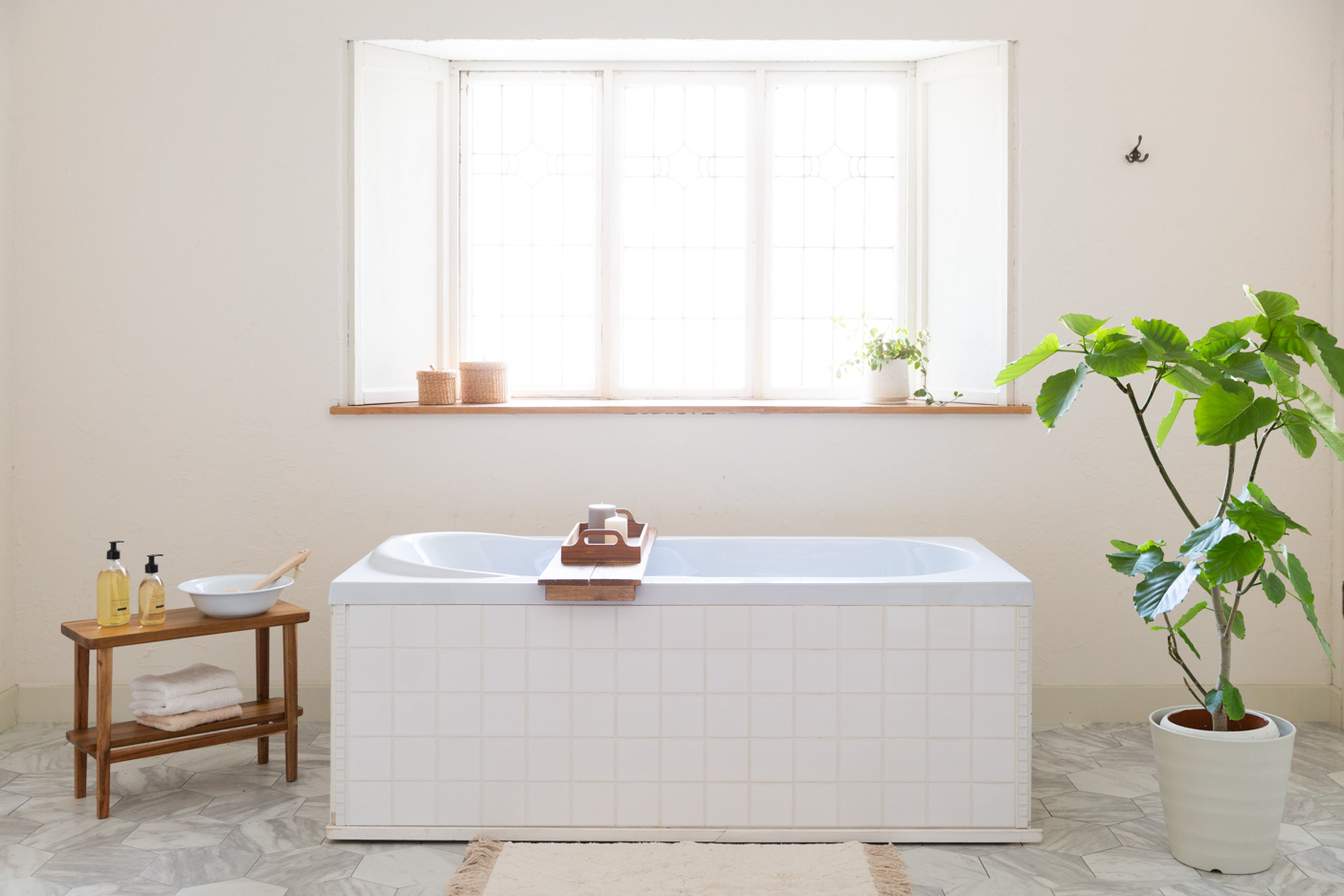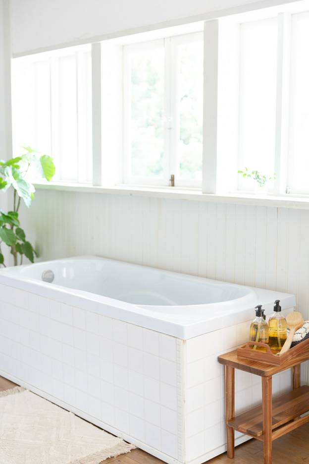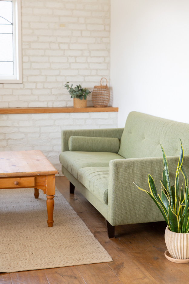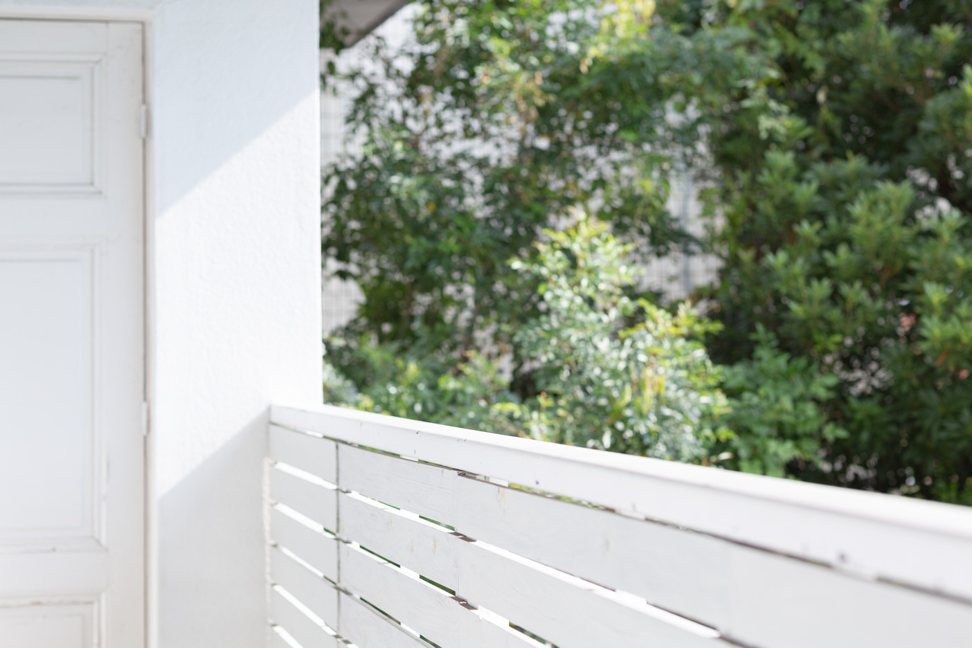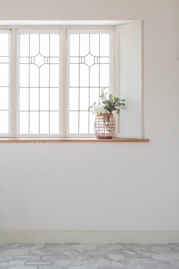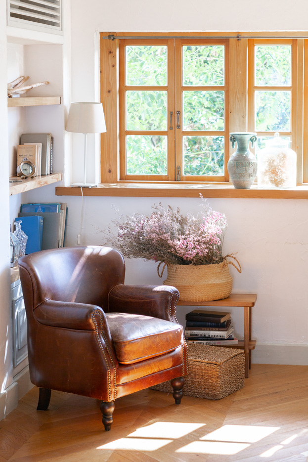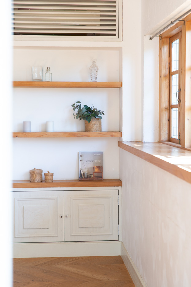 見晴らしのよいテラスと、アンティークを取り入れた可愛らしい雰囲気。大人の女性の部屋をイメージした上品な壁紙と、落ち着いた色合いの腰壁。パステルカラーのドア、白い煉瓦の壁も印象的。ナチュラルな木の床が柔らかさを作っています。