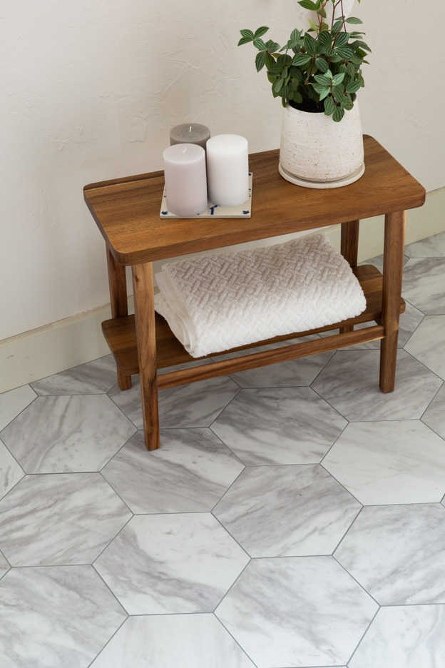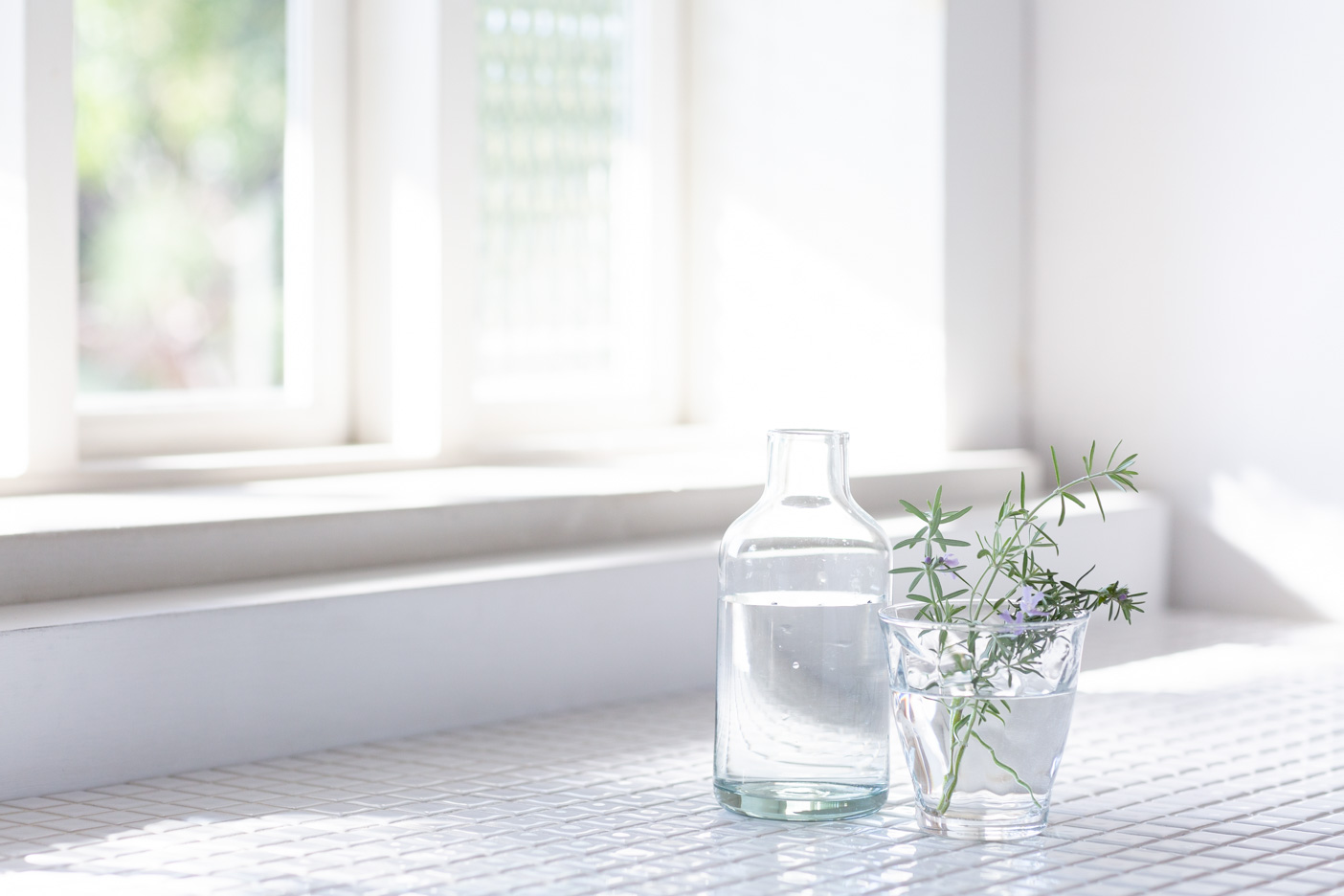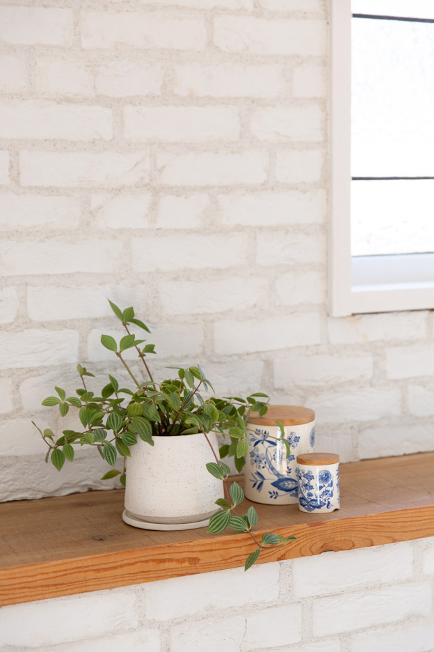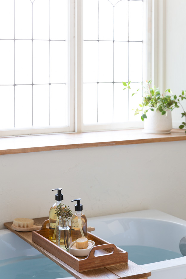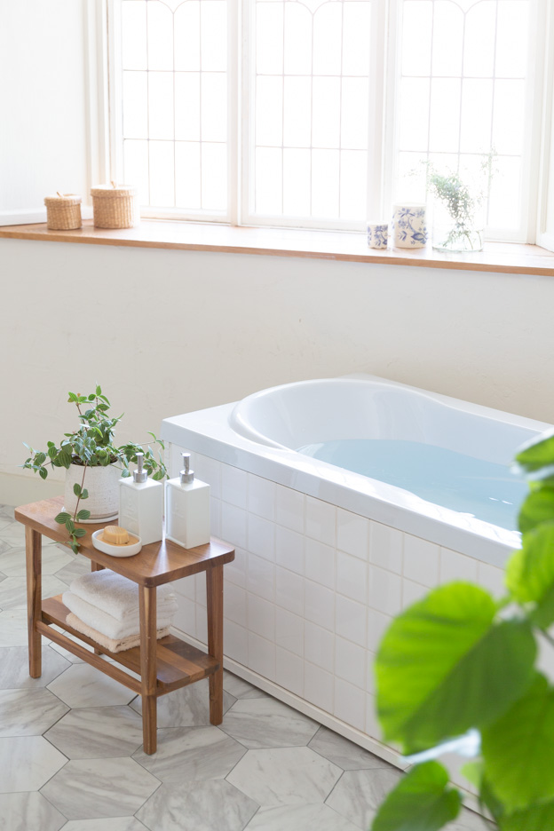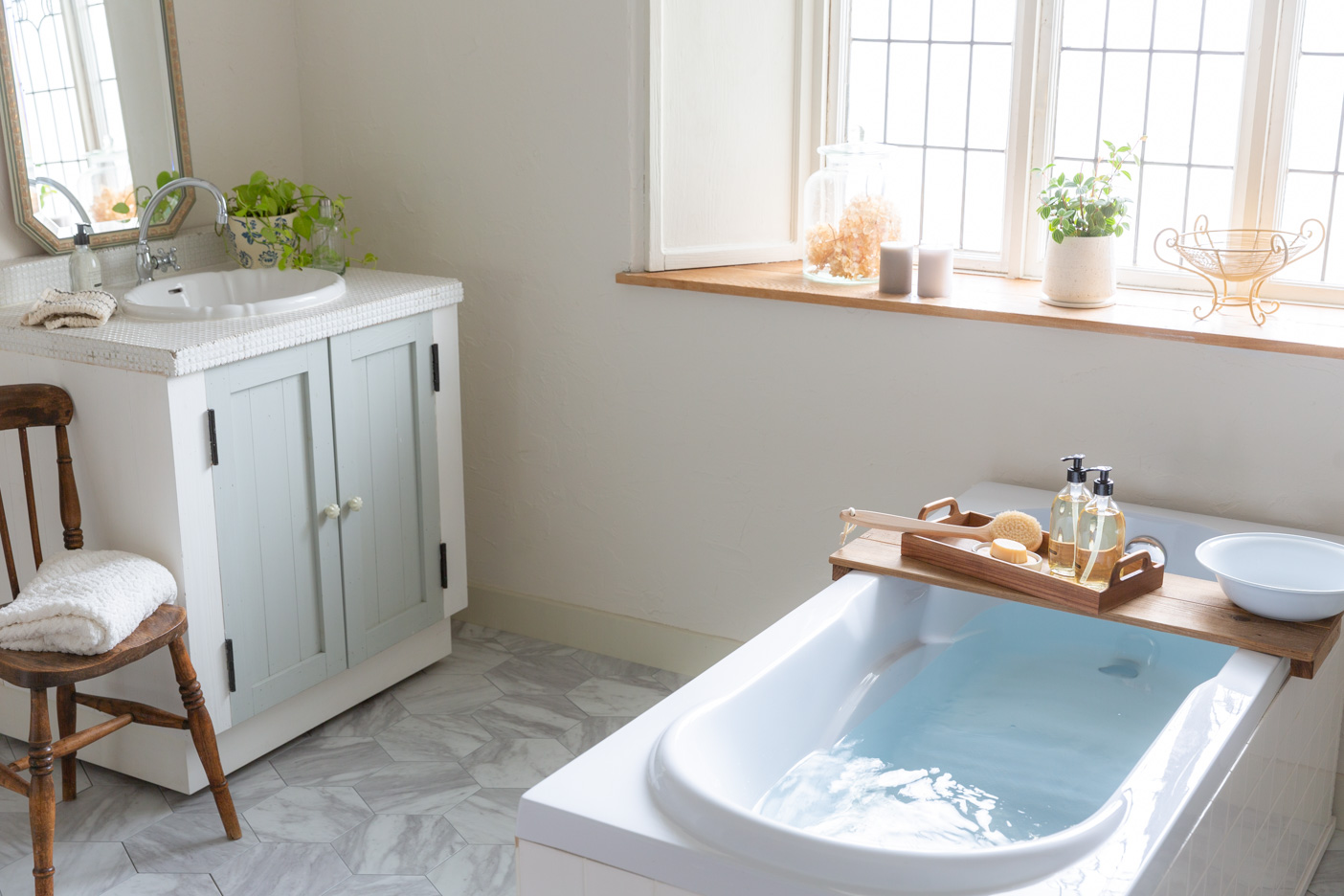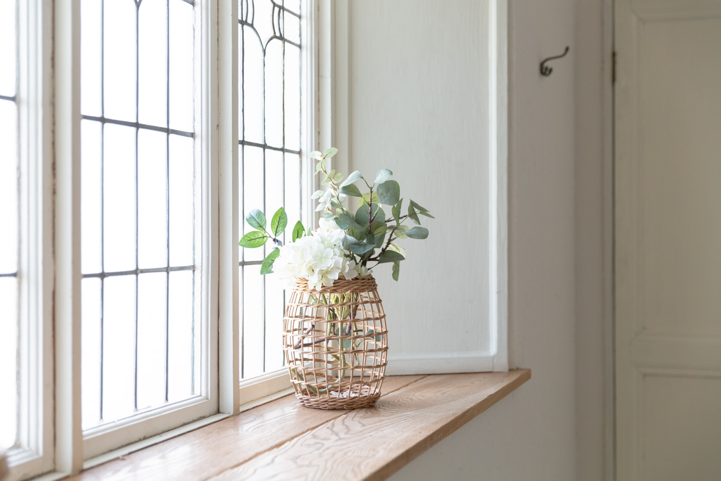 見晴らしのよいテラスと、アンティークを取り入れた可愛らしい雰囲気。大人の女性の部屋をイメージした上品な壁紙と、落ち着いた色合いの腰壁。パステルカラーのドア、白い煉瓦の壁も印象的。ナチュラルな木の床が柔らかさを作っています。